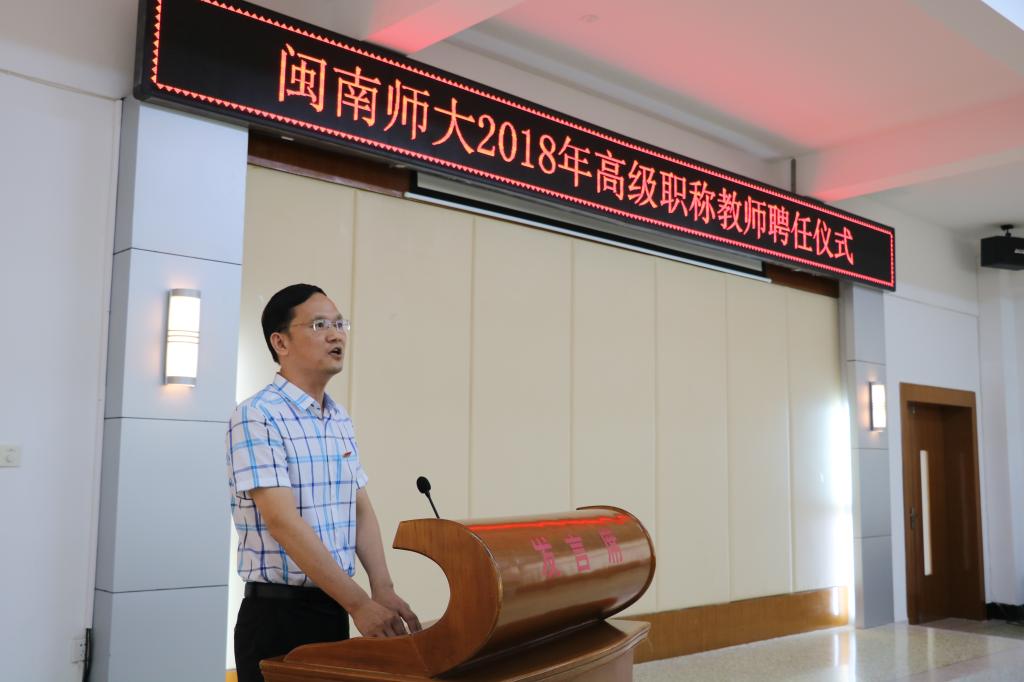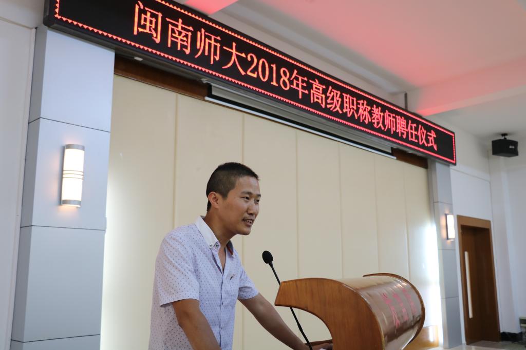 校党委书记吴彬镪、校长李顺兴为2018年新聘任高级职称教师颁发聘书。化学化工与环境学院黄明强教授代表新聘任高级职称教师发言,表示将以此次聘任为新起点,时刻铭记“博学、明理、砺志、笃行”的校训,爱岗敬业、为人师表,严格要求自己、真诚关爱学生,勇于创新、拓宽视野、更新知识,不断提高教学水平和科研能力,自觉肩负起教书育人的光荣使命,为“新闽师”建设作出新的贡献。