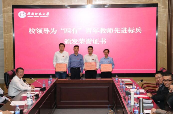 校党委书记吴彬镪为“四有”青年教师“先进标兵”颁发荣誉证书