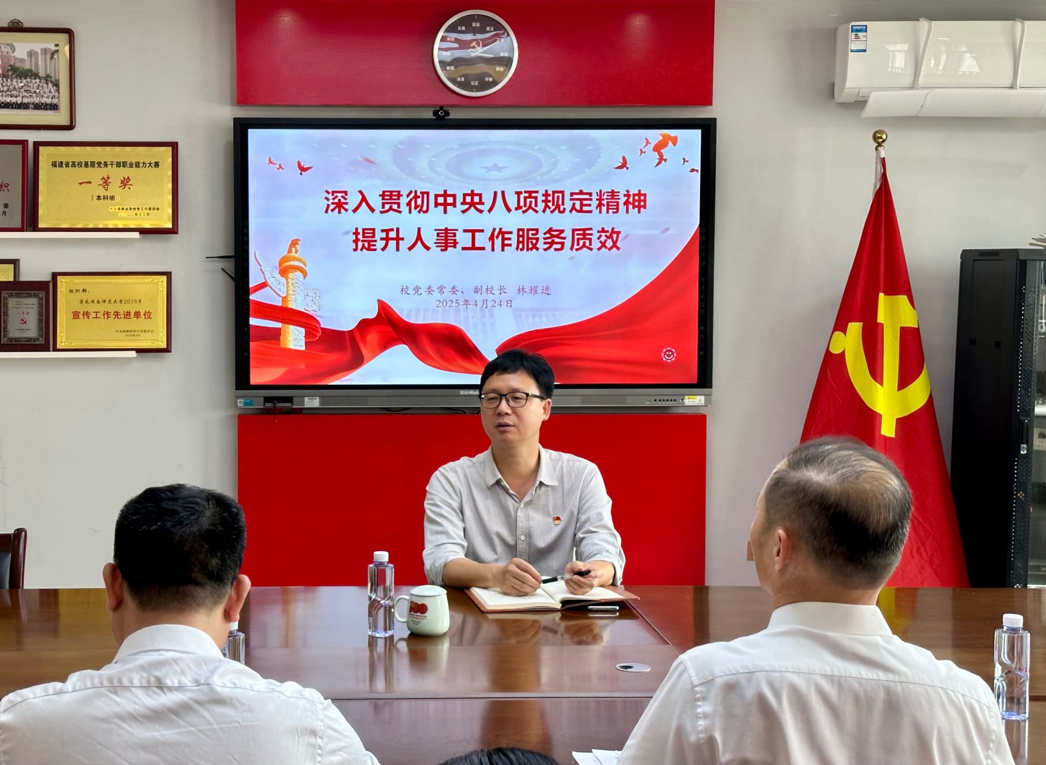 4月24日下午,校党委常委、副校长林耀进为教师工作部党支部讲授题为《深入贯彻中央八项规定精神 提升人事工作服务质效》的专题党课。