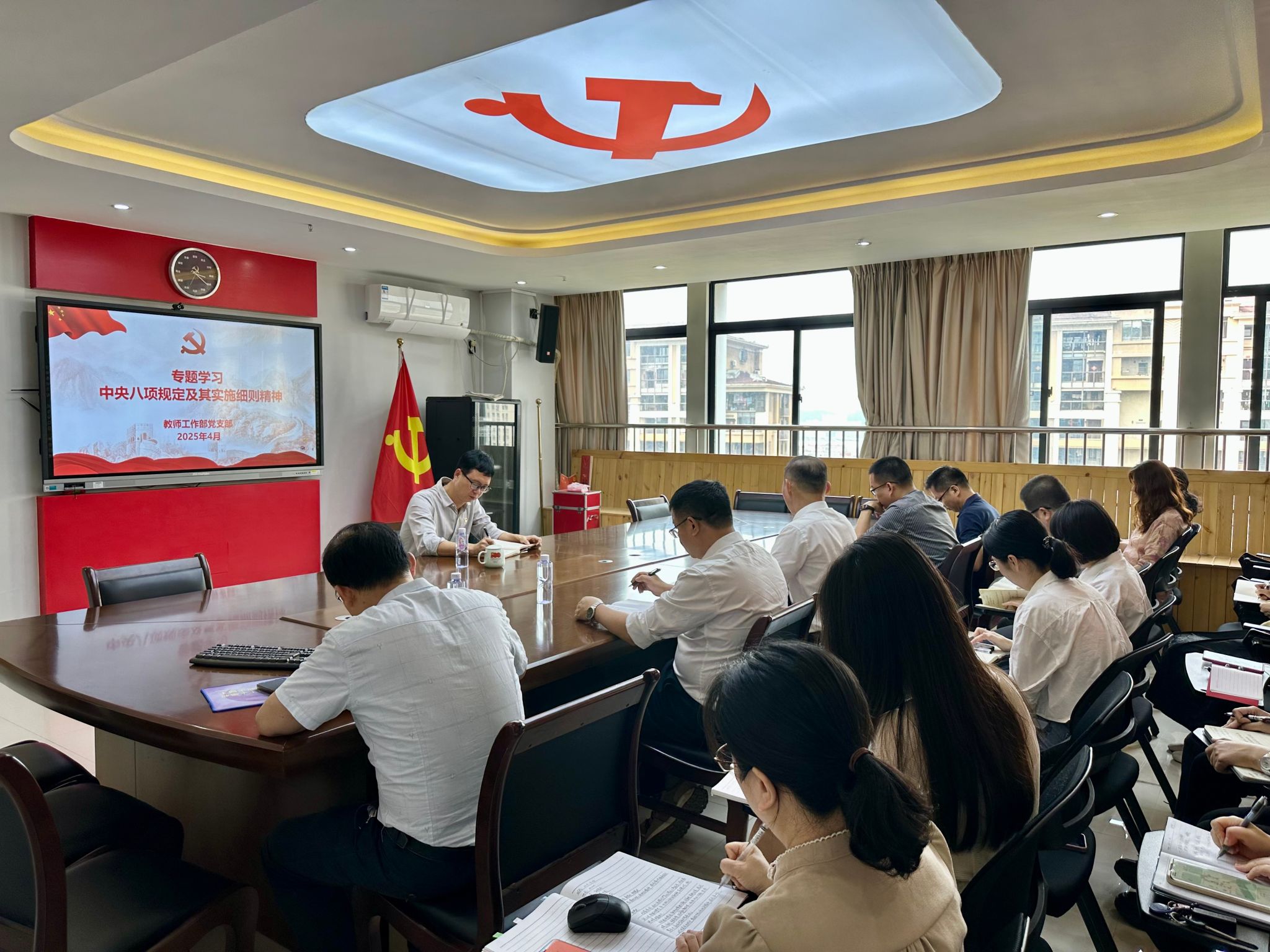 近日,为深入学习贯彻习近平总书记关于加强党的作风建设的重要论述,推动深入贯彻中央八项规定精神学习教育走深走实,教师工作部党支部召开专题学习会,学习中央八项规定及其实施细则。党支部书记黄伟东主持会议。