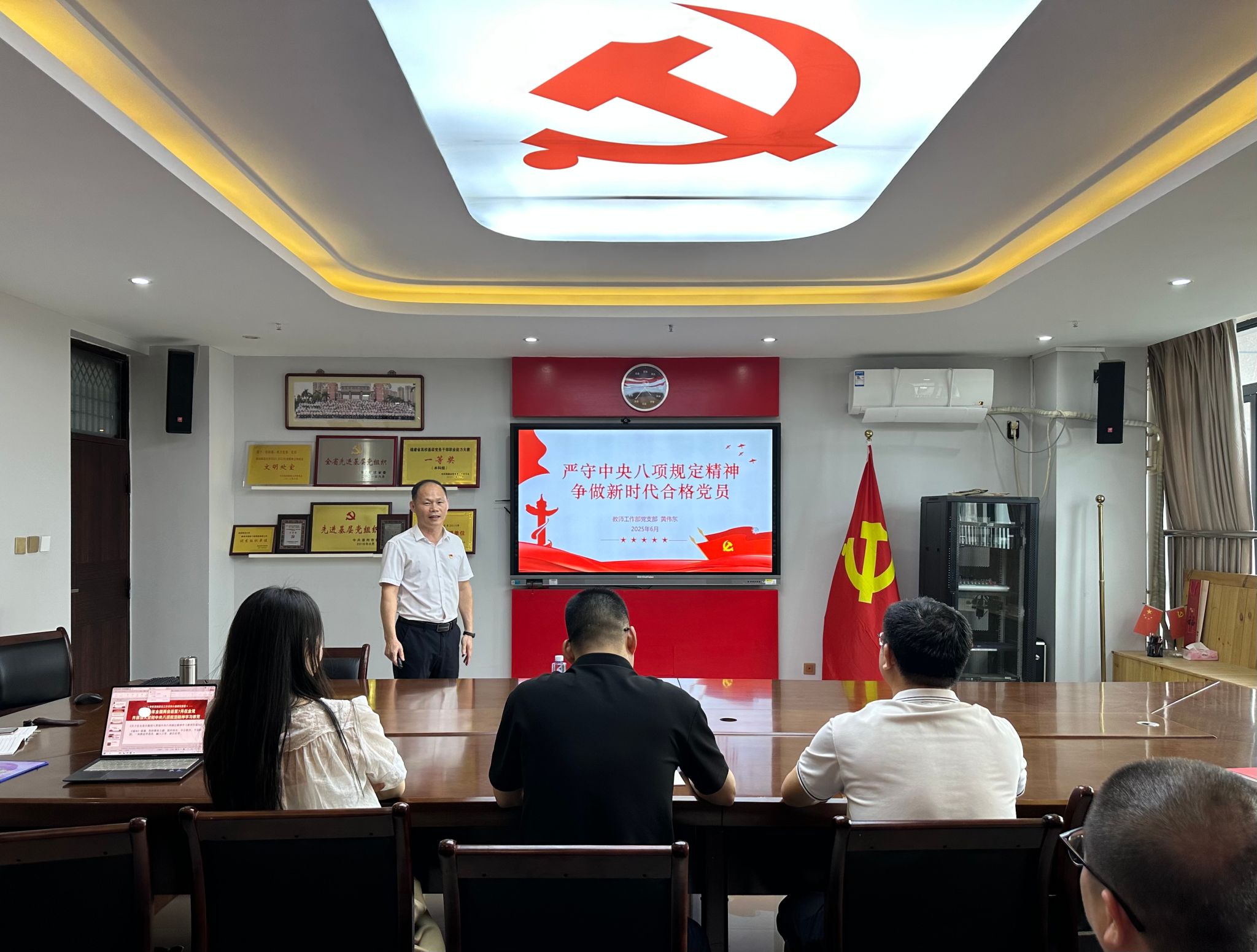 6月12日下午,教师工作部党支部书记黄伟东以《严守中央八项规定精神 争做新时代合格党员》为题,为全体党员讲授党课。