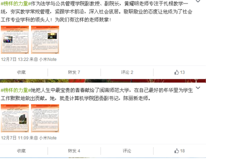 学校通过多措并举,我校师德师风建设工作卓有成效,涌现出了一批爱岗敬业、热爱学生、严谨治学、师德高尚、廉洁奉公的优秀教师典型。宣传部、教师工作处充分发挥典型榜样的示范、辐射、引领作用,通过电子显示屏、校报、广播电台、微博、微信等宣传阵地,开展立体化、全方位的师德师风宣传教育,树立模范榜样。整理收集学校三级以上教授的资料,在新浪官方微博推出#名师在闽师#展示活动,得到粉丝的积极点赞。组织学生记者采访优秀教师,在官方微博以#榜样的力量#推出优秀教师、优秀教育工作者先进事迹宣传;在官方微信开辟【闽师人物】专栏;在《tyc5997太阳集团校报》上开辟师德人物专栏;设计制作师德师风户外宣传栏80个版面,分布在学校各主干道宣传展出;编印《榜样的力量——闽南师大2015年优秀教师、优秀教育工作者事迹汇编》发放给教师,用身边人、身边事潜移默化地教育和影响身边的广大师生,使广大教职工学有标杆、比有方向、赶有目标,在全校形成见贤思齐、比学赶帮的良好氛围。